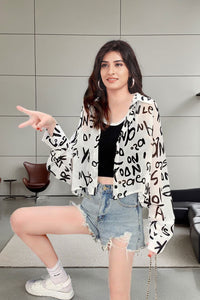 Classic White Crop Top: Paired with the printed sheer shirt is a classic white crop top, designed for comfort and style. Made from soft, stretchable material, this crop top offers a snug, flattering fit, perfect for layering or wearing on its own.