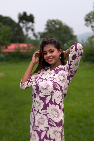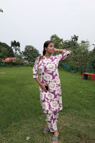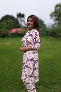 Step into effortless style with our Purple Big Floral Printed Rayon Co-ord Set, designed for the modern woman who loves comfort with a touch of bold elegance. Made from soft, flowy rayon fabric, this co-ord set features a coordinated top and bottom with striking oversized floral prints that make a statement.